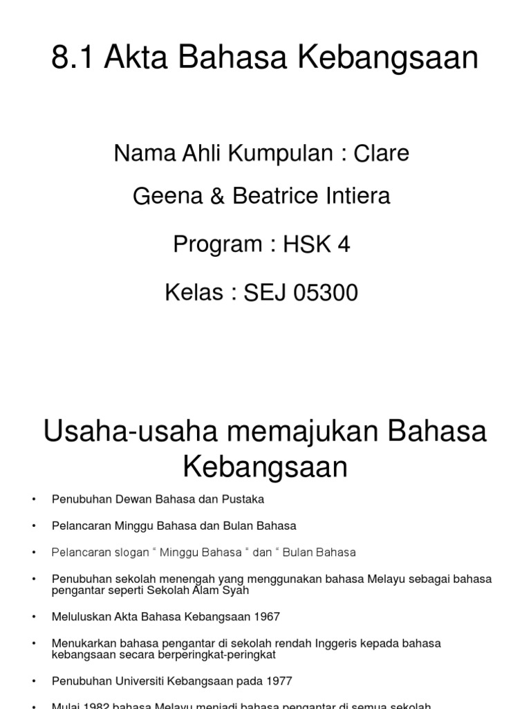 Meningkatkan penguasaan kosa kata bahasa inggris siswa kelas 2 sma negeri 10 pekanbaru melalui tiga phase pengajaran meningkatkan penguasaan. Jika dahulu perbendaharaan kata bahasa arab. Tujuan:tujuan bahasa melayu dipilih menjadi bahasa kebangsaan adalah untuk mewujudkan identiti dan integrasi nasional melalui bahasa melayu. Akta bahasa kebangsaan langkah/usaha/cara memajukan bahasa melayu: Akta suruhanjaya pelabuhan pulau pinang 1955. • penubuhan dewan bahasa dan. Yang pertama adalah terbentuknya bangsa yang kuat, kukuh bersatu, berdaya saing tinggi, dan sejahtera. Empat pilar kebangsaan dan bernegara indonesia. Tingkatan 5 bab 8 dasar pendidikan kebangsaan soalan spm. Akta cukai pendapatan tambahan 1967. Satu perjuangan nasionalisme dari 1930 sehingga 1967. Akta ini memartabatkan bahasa melayu sebagai bahasa kebangsaan seperti yang termaktub dalam perlembagaan & menjadi jaminan kepada perpaduan rakyat malaysia. Kepentingannya sebagai bahasa ilmu yang menjadi medium pengajaran dan pembelajaran telah membawa kepada pewartaan akta pendidikan 1961 (pindaan 1996).