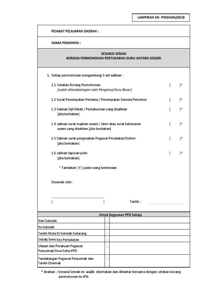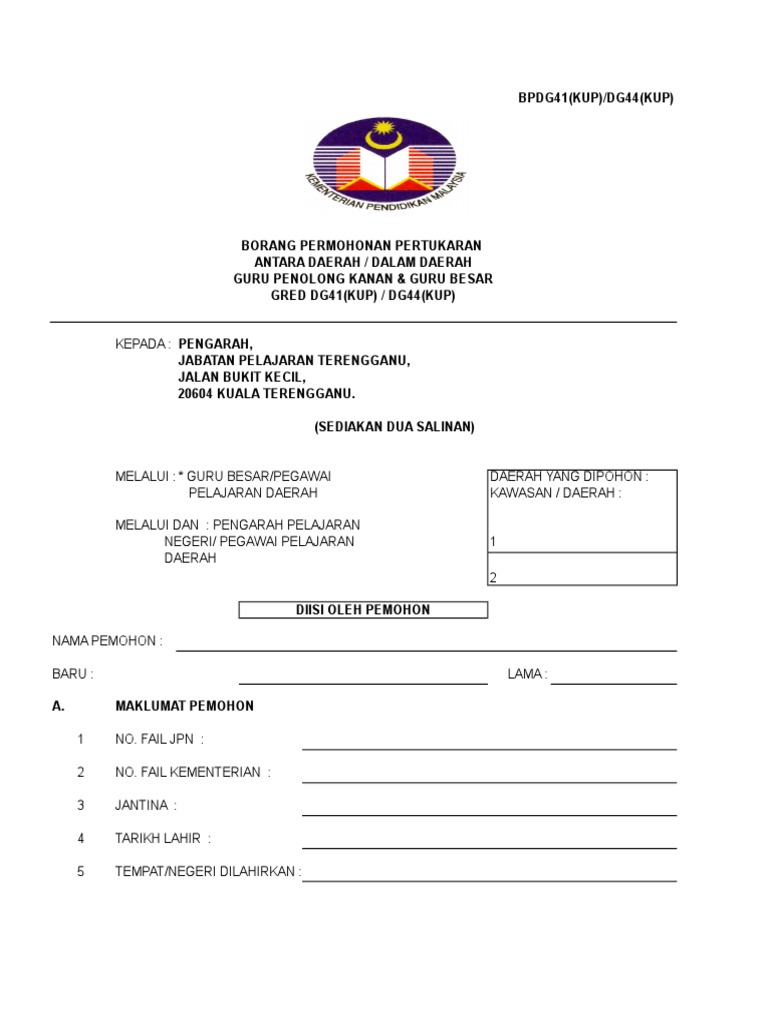 Related : Borang Pertukaran Guru Antara Daerah / Bagi urusan pertukaran antara negeri / bahagian, guru gred dg42 (kup), guru cemerlang, dan guru tingkatan enam yang sedang memangku boleh memohon melalui sistem tetapi pertukaran pegawai akan diproses selepas pegawai disahkan kenaikan pangkat.