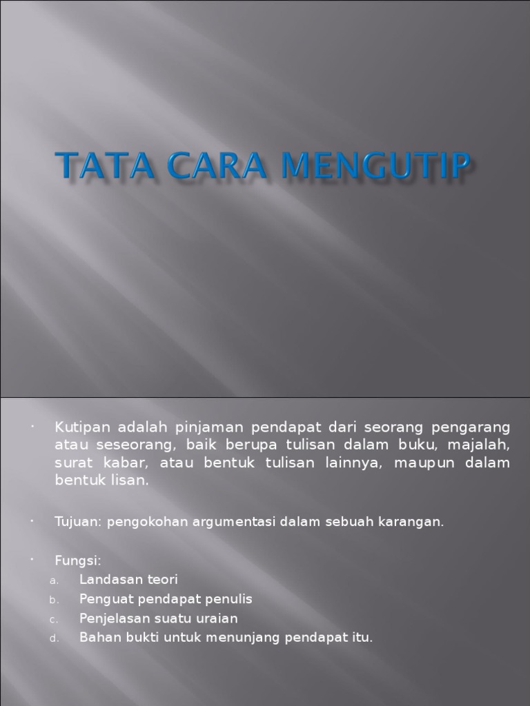 Memperkirakan apa yang dibutuhkan dalam surat lamaran kerja dari perspektif perusahaan. Cara menulis daftar pusataka dari jurnal akan kita bahas kali ini. Elemen yang wajib dicantumkan yaitu nama penulis, tahun terbit, judul, kota dan nama penerbit. Daftar rujukan ini ditulis jika dalam tulisan memang menggunakan rujukan dari orang lain/menggunakan kutipan. Nama penulis pertama tulislah nama penulis makalah tersebut lalu beri tanda koma pada akhir nama.
