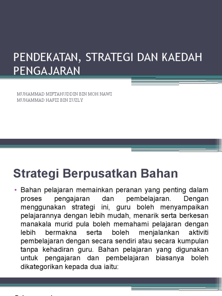 Strategi Pengajaran Berpusatkan Murid : Syrvison siggoh pismp bkd sem 2.. Satu strategi yang telah disarankan untuk mencapai taraf pencapaian murid yang maksimum ialah penggabungjalinan. Strategi yang kedua adalah strategi pengajaran yang berpusatkan murid. Di bawah strategi berpusatkan murid ini, murid memainkan peranan yang penting dalam proses pembelajaran. Tajuk invensi dan inovasi dalam reka bentuk. Strategi, kemahiran,pendekatan dan kaedah pengajaran dan pembelajaran strategi.