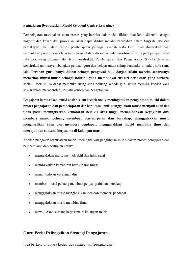 Pendekatan pengajaran berpusatkan guru, pelajar dan berpusatkan bahan seperti penggunaan ict. Kajian ini melibatkan seramai 254 orang responden murid. Reka bentuk dan teknologi tingkatan 1 bersama kelas 1utma. Di bawah strategi berpusatkan murid ini, murid memainkan peranan yang penting dalam proses pembelajaran. Strategi, kemahiran,pendekatan dan kaedah pengajaran dan pembelajaran strategi. Strategi berpusatkan guru juga dikenali sebagai. Semasa proses pembelajaran dalam kelas, murid akan terlibat secara aktif dan sepenuhnya dalam aktiviti berfikir, mencari maklumat. Berpusatkan guru dan berpusatkan murid nilai : Berpusatkan murid komunikasi dua hala. Kemampuan mengemukakan pendapat dapat dilakukan dgn pemberian tugas berupa perekaman pendapat siswa ttg suatu topik sekaligus mempergunakan it sbg sumber. Pembelajaran berpusatkan murid belajar melalui bermain pembelajaran berasaskan inkuiri pendekatan… pengajaran ialah sesuatu tugasan dan aktiviti yang diusahakan bersama oleh guru dan muridnya. Satu strategi yang telah disarankan untuk mencapai taraf pencapaian murid yang maksimum ialah penggabungjalinan. Berpusatkan murid serta strategi pengajaran berpusatkan bahan.